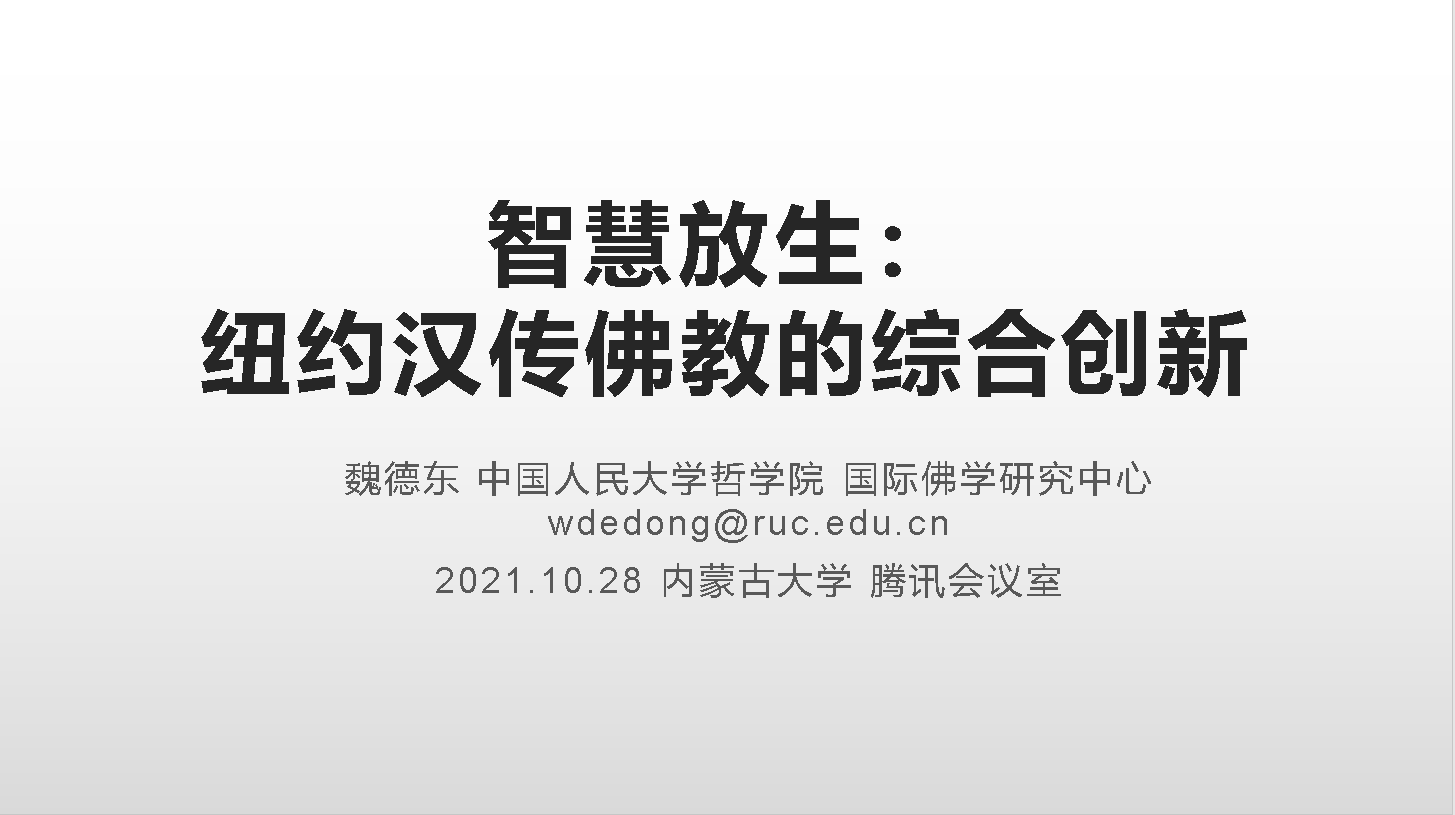 2021年10月28日,中国人民大学哲学院教授、佛教与宗教学理论研究所研究员、国际佛学研究中心主任、中共中央统战部宗教工作专家魏德东教授受邀线上为我院师生做了一场题为《智慧放生:纽约汉传佛教的综合创新》的讲座。本次讲座由tcy8722太阳集团中华民族共同体研究中心和太阳集团tcy8722共同主办,由梅花教授主持。