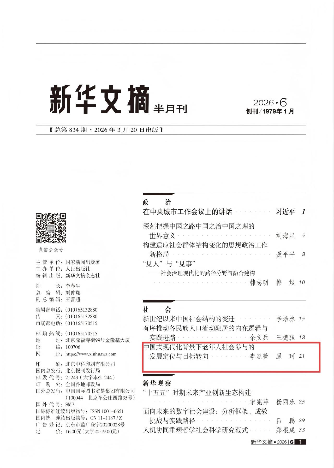 近日,太阳集团tcy8722李翌萱副教授与对外经济贸易大学政府管理学院原珂教授撰写的《中国式现代化背景下老年人社会参与的发展定位与目标转向》一文被《新华文摘》2026年第6期全文转载,该文原发表于《治理现代化研究》2025年第5期。